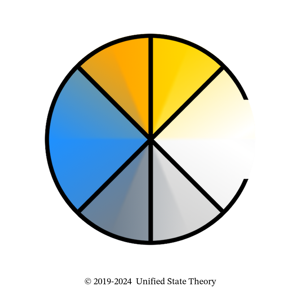 The Complex Sixfold image from the Unified State Theory represents the same as the regular Sixfold except that instead of flat colours, gradients are used to better articulate the point that states of consciousness are spectrum and not just polarity.